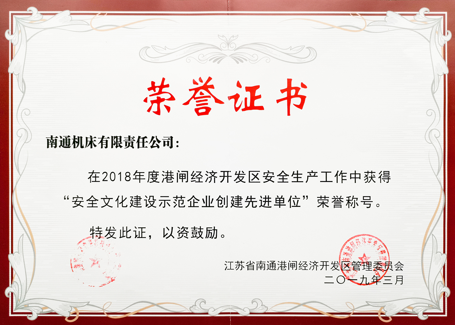 2018年度港閘經濟開發區安全生產先進集體和先進個人。南通機床獲 “安全文化建設示范企業創建先進單位”榮譽稱號。