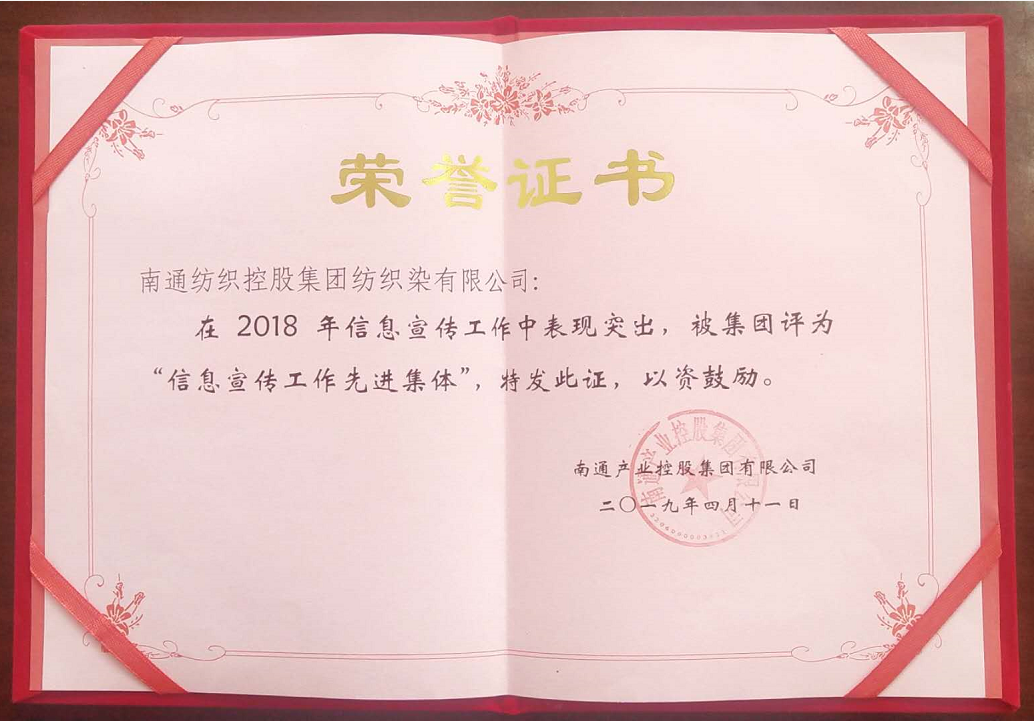 4月12日下午,產(chǎn)控集團(tuán)召開(kāi)了產(chǎn)控系統(tǒng)辦公室主任工作會(huì)議,會(huì)上對(duì)2018年度通訊宣傳工作,進(jìn)行了表彰,南通紡織控股集團(tuán)紡織染有限公司榮獲2018年度產(chǎn)控集團(tuán)“信息宣傳工作先進(jìn)單位”榮譽(yù)稱號(hào)。