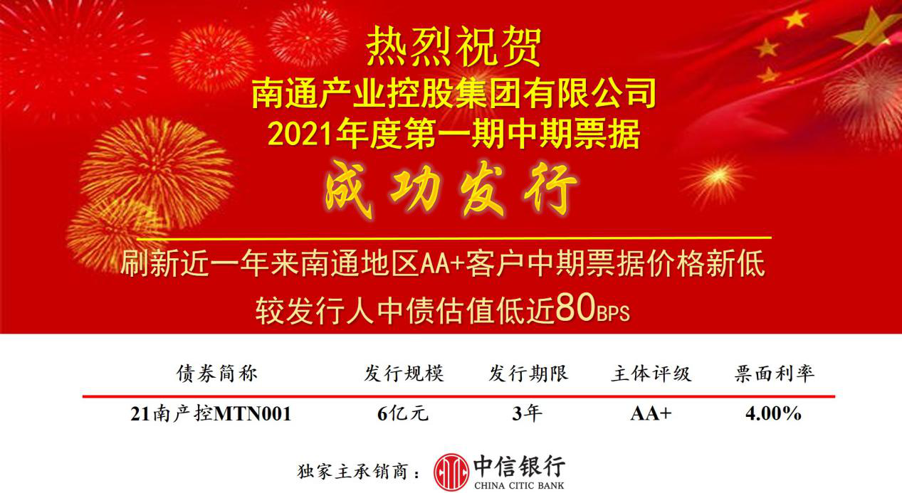2021年4月22日,產(chǎn)控集團成功發(fā)行6億元中期票據(jù)。由于產(chǎn)控集團的良好資質(zhì)得到投資者的認可,本期中票簿記倍數(shù)1.6倍,邊際倍數(shù)1.16倍,票面利率4%,比集團三年期債券估值低近80BPS,同時創(chuàng)下了近一年來南通地區(qū)AA+評級中期票據(jù)價格新低。