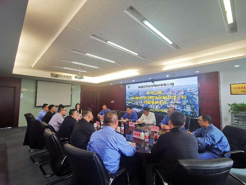 為全方位深度擰緊安全環保責任鏈條,進一步提高企業環保本質化治理能力和水平,10月18日上午,南通市公安局黨委副書記、副局長郭玉家一行來到南通江天化學股份有限公司開展工作走訪調研。江天化學黨支部書記、副總經理張永鋒、黨支部副書記、副總經理沙曉東、支部委員、副總經理任建軍等陪同調研參觀。
